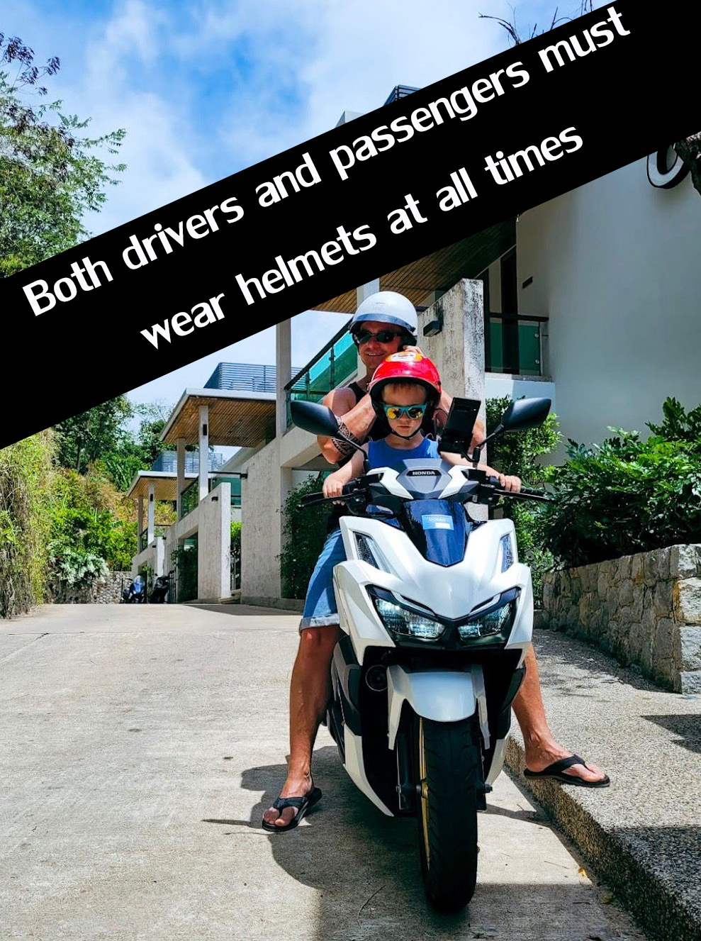 • Helmets: Both drivers and passengers must wear helmets at all times while riding on public roads (this is required by law and subject to strict fines in Phuket).• Obey traffic laws: Drive carefully, avoid speeding, drive against traffic, and obey traffic signs.